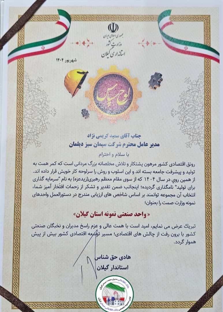 این مراسم با حضور جناب آقای دکتر حق شناس استاندار گیلان و جناب آقای دکتر پورحیدری مدیرکل صنعت، معدن و تجارت استان برگزار شد و طی آن از تلاشها و دستاوردهای این شرکت در زمینه تولید، نوآوری و نقشآفرینی در توسعه اقتصادی استان قدردانی شد.